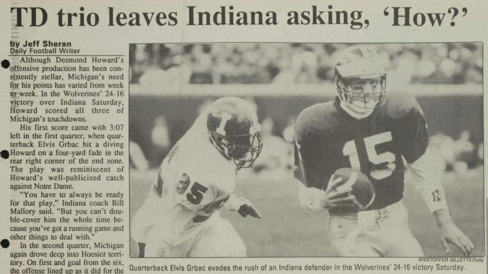 While Howard accumulated far bigger numbers in other games, his stat line against Indiana may be my favorite: five catches for 32 yards (long of 12) and three touchdowns. A 5-32-3 line looks like it should be in the rushing section.