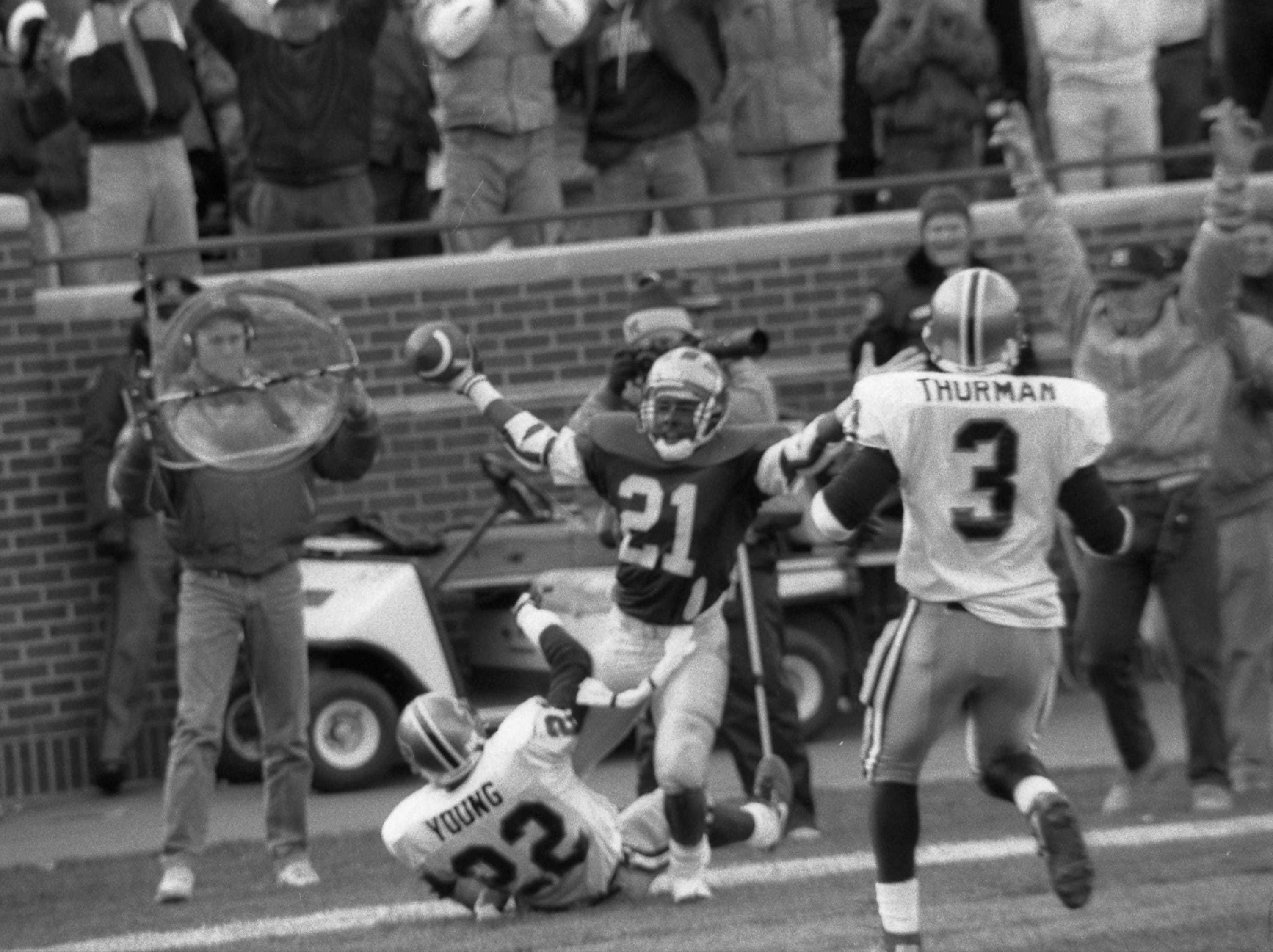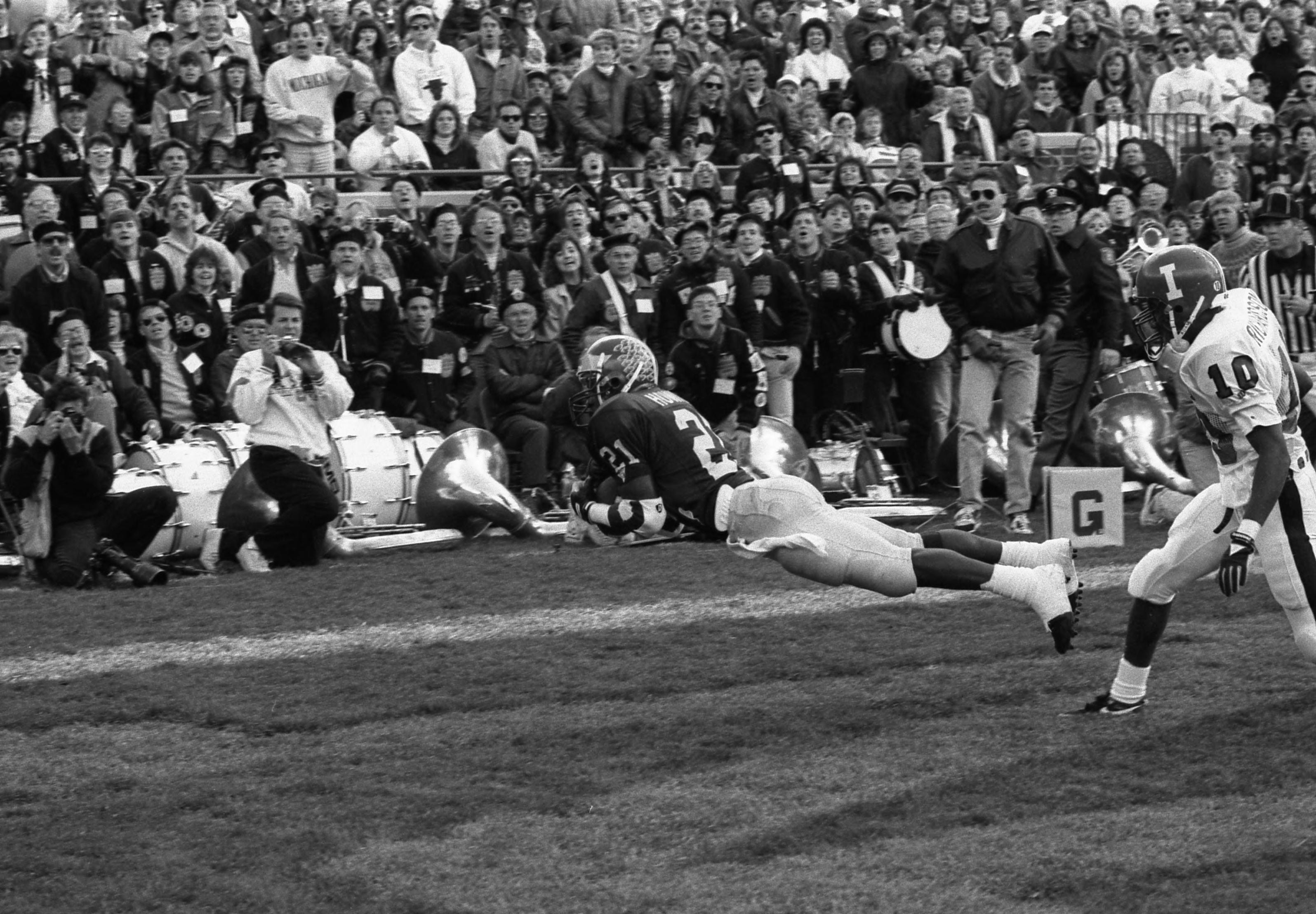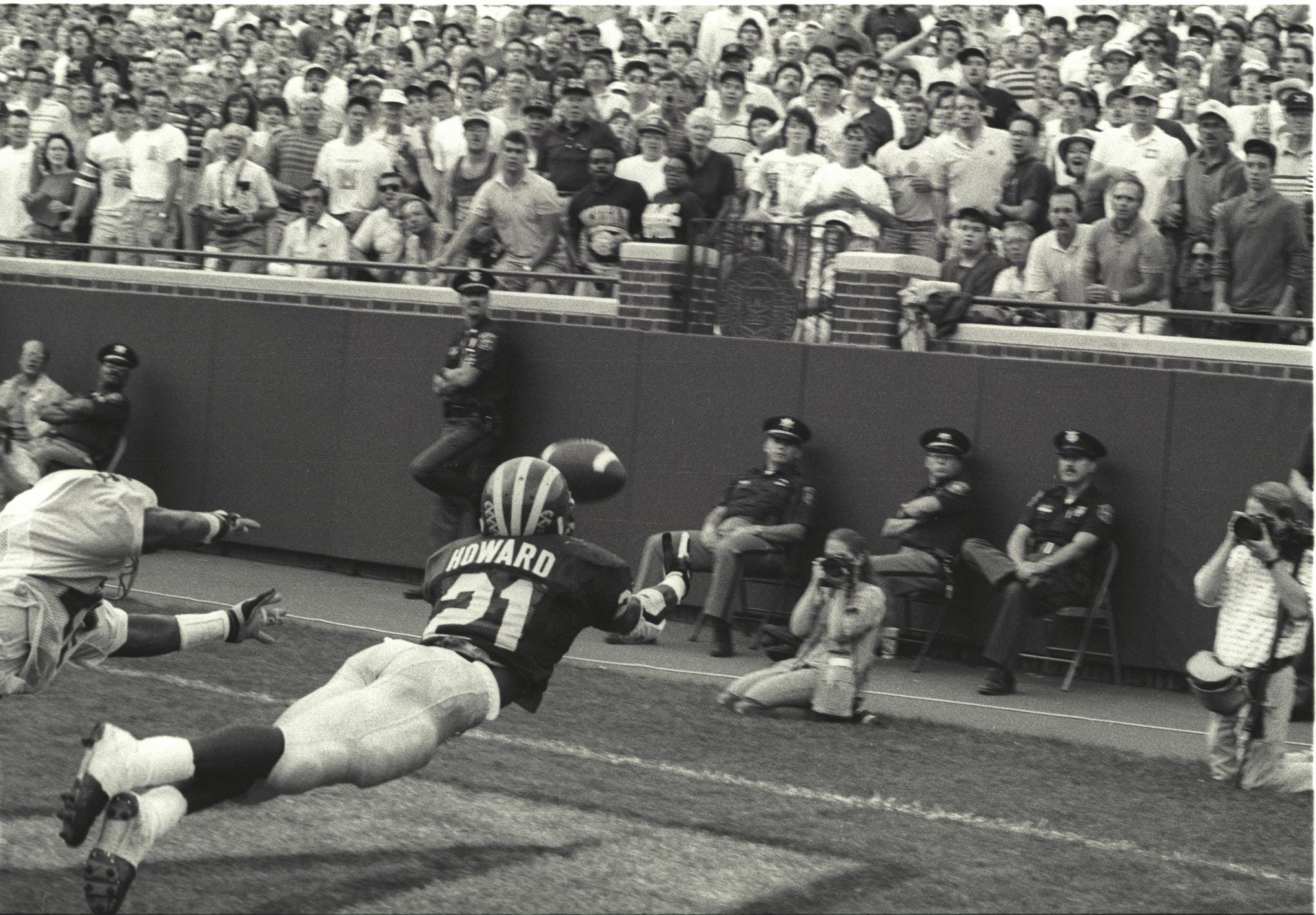 A punt return sealed the 1991 Heisman Trophy. Dominating the goal line as a 5-foot-9 wide receiver put Desmond Howard in position to strike the pose.