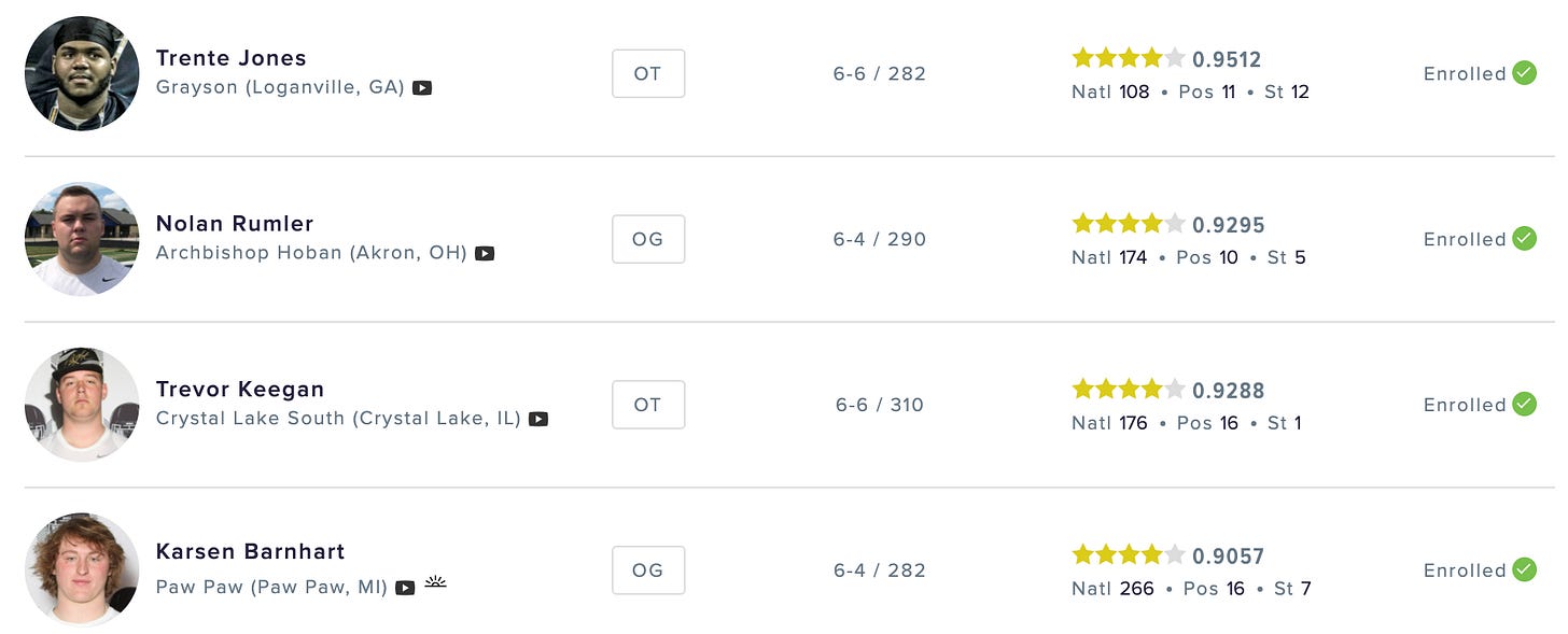 On the offensive line, yet again, there’s more than enough talent to assemble a strong front. Senior Ryan Hayes is an established starter at left tackle and a former four-star. Fifth-year Andrew Stueber has proven solid at both guard and tackle. Here are the four remaining offensive line recruits from the 2018 class: